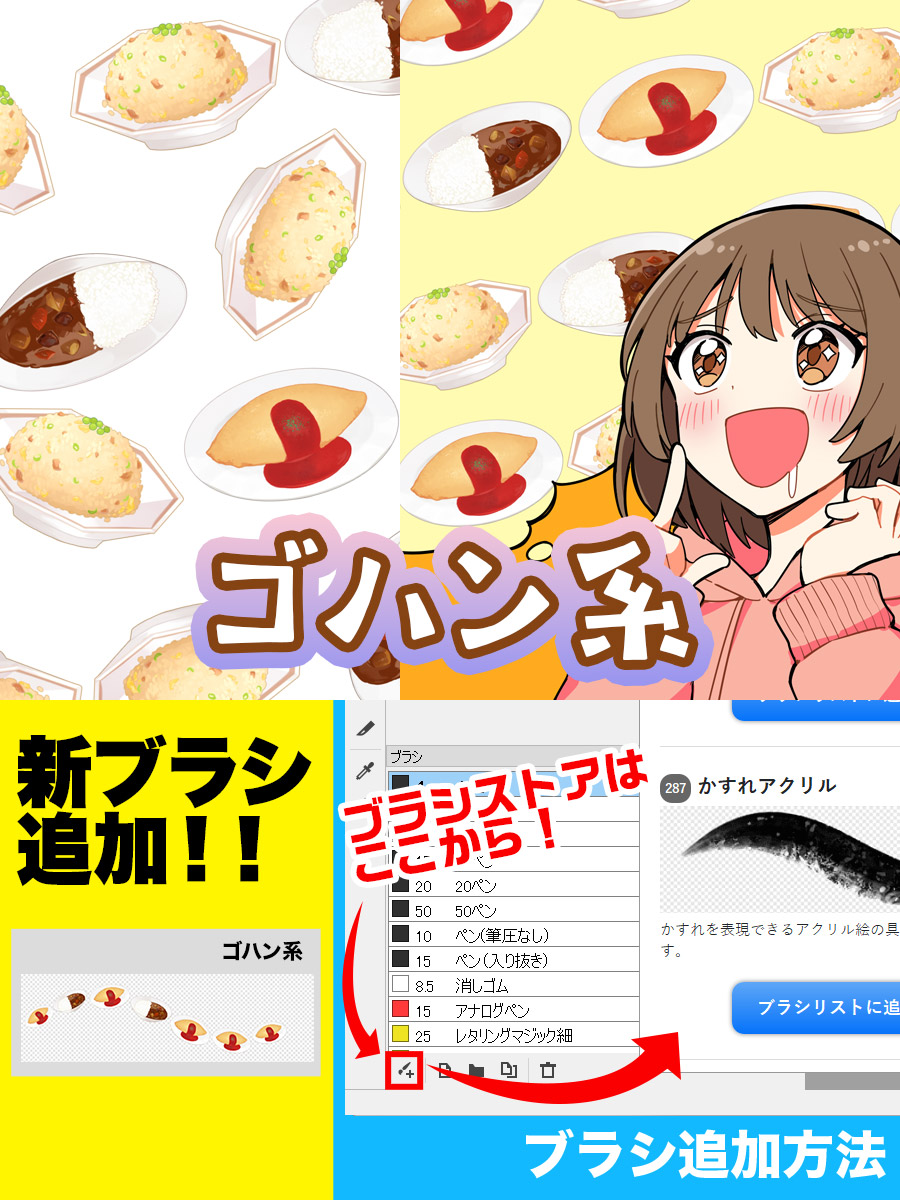 素材(ブラシ) 「ゴハン系」ブラシを追加 2025.10.10 🔥🦙新ブラシ追加!🦙🔥 「ゴハン系」のブラシを追加しました! いろんなゴハンのが手軽に描けるスタンプ風ブラシです😋 Post Share Hatena RSS Pin it