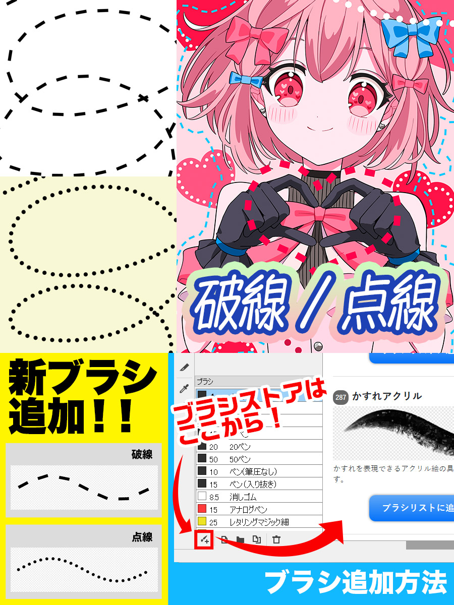 素材(ブラシ) 「破線」「点線」ペンを追加 2025.09.26 🔥🦙新ブラシ追加🦙🔥 「破線」「点線」ペンを追加しました! 好みに調整できるスクリプトブラシです✨✨ Post Share Hatena RSS Pin it