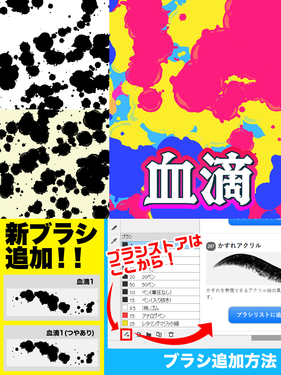 素材(ブラシ) 「血滴」ブラシを2種類追加 2026.01.09 🔥🦙新ブラシ追加!🦙🔥 「血滴」ブラシを2種類追加しました! ポタポタと落ちた液体が描けるブラシです🩸🩸 Post Share Hatena RSS Pin it